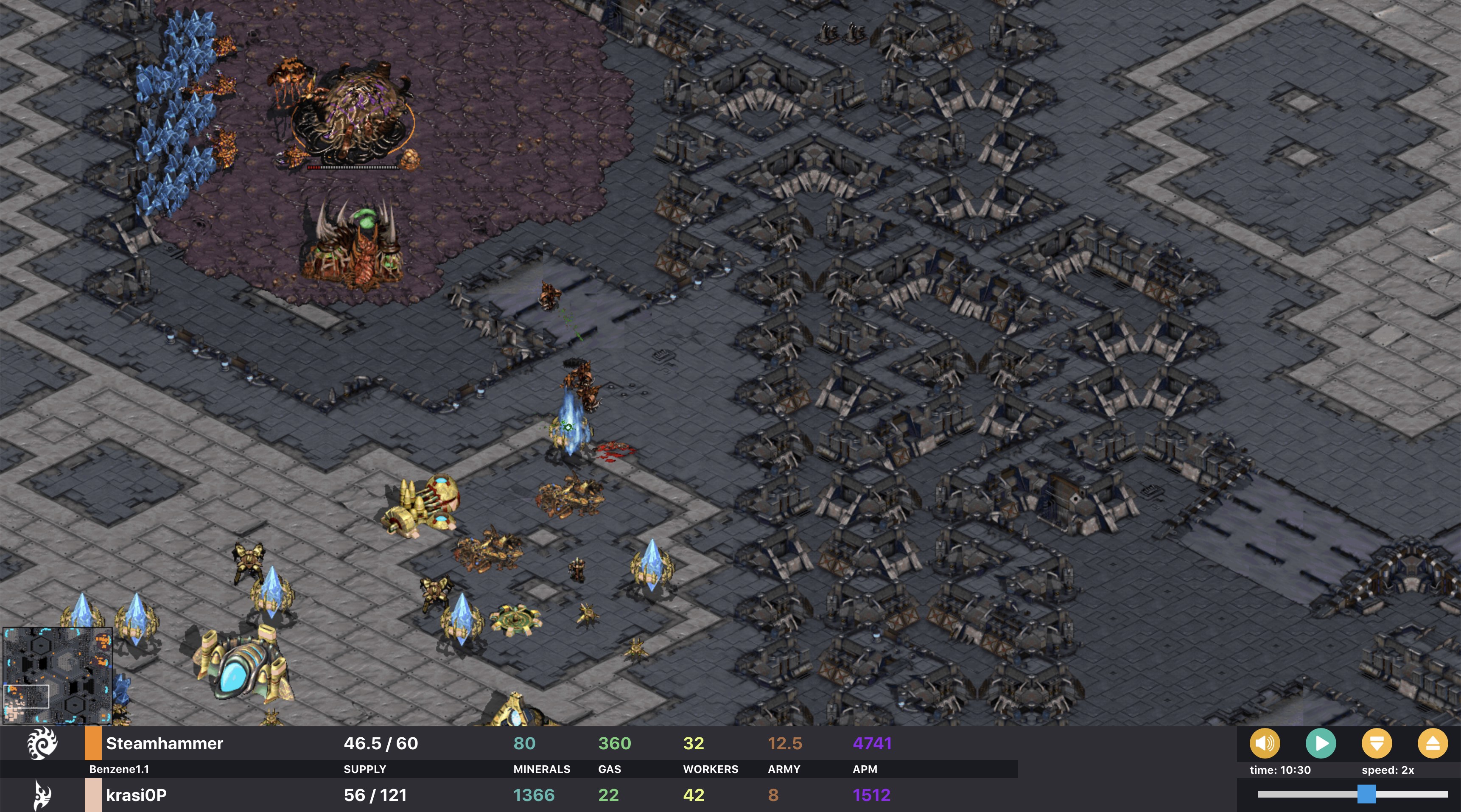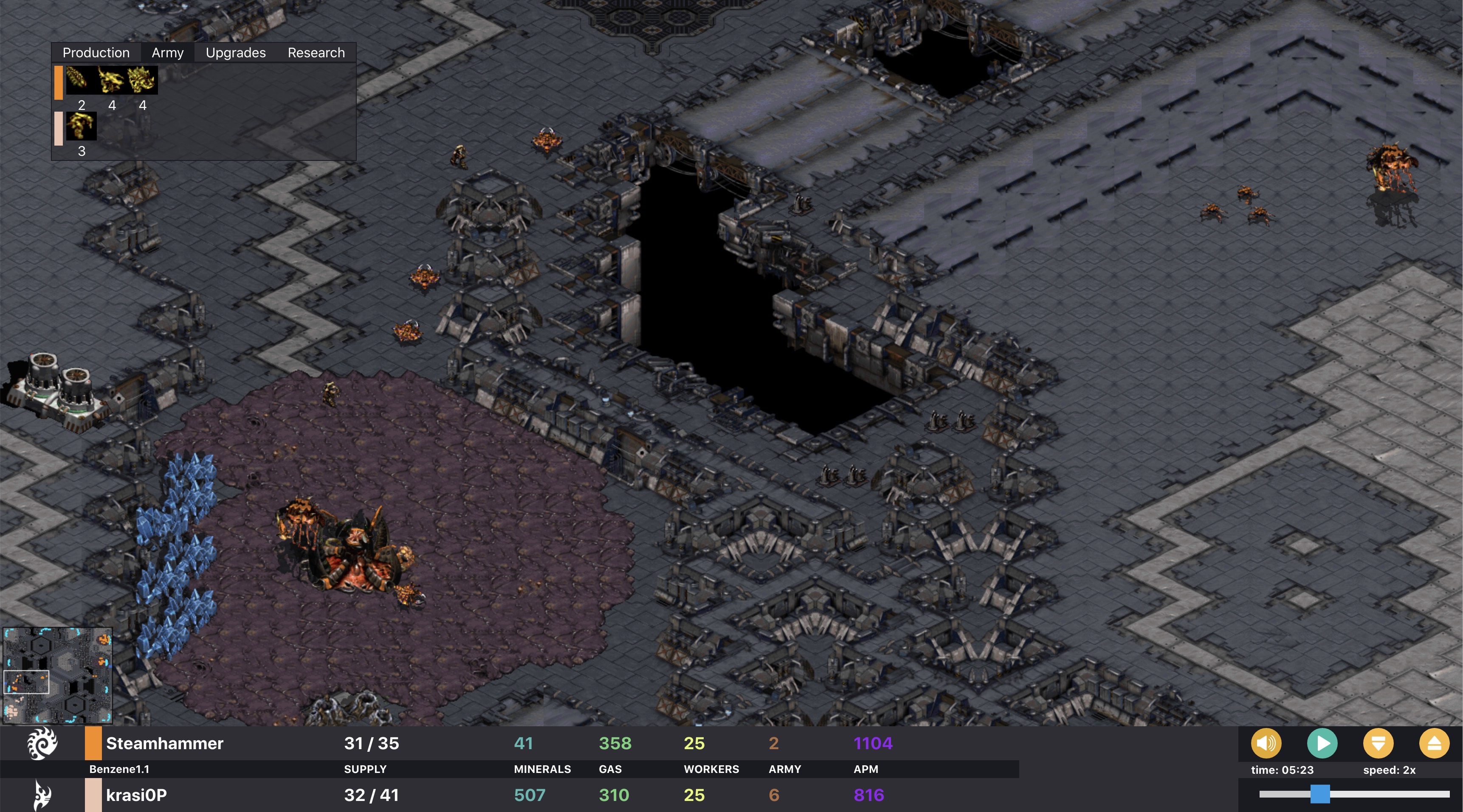 In the picture, Steamhammer has calmly morphed its proxy hatchery into a lair and started spawning drones in what it sees as a perfectly normal expansion. Never mind that the lair should be morphed where it won’t be seen immediately, and where it is less likely to be destroyed in passing. It happened to turn out well, since the lair had more HP. In the minimap we can see that zerg has also made a third hatchery at its natural. No hurry, after all protoss made cannons so a nice slow macro game should be in the cards, Steamhammer seems to believe. And in fact Krasi0P is adding another cannon beside its nexus for no apparent reason, and making its cyber core. First tech, then act, is its plan.