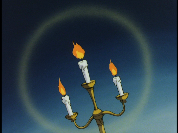 In The Rose of Versailles, in episode 15 honest and religious Marie Antoinette is corrupted into taking up illegal gambling. Immediately before the gambling scene, we see these three candles, surrounded by a halo and seeming to stand against a twilight sky. I think they stand for the Christian holy trinity (other candles get a halo of light, but these candles are picked out as special by the dutch angle, non-real background, and more detailed animation). I guess the center candle with its larger flame is the holy spirit. They contrast with Marie Antoinette’s sin in gambling for entertainment with the people’s tax money. Maybe these three candles are telling us that Marie Antoinette’s inner spirit remains pure and uncorrupted; she gives up gambling (as well as the lie of being pregnant) during the same episode.