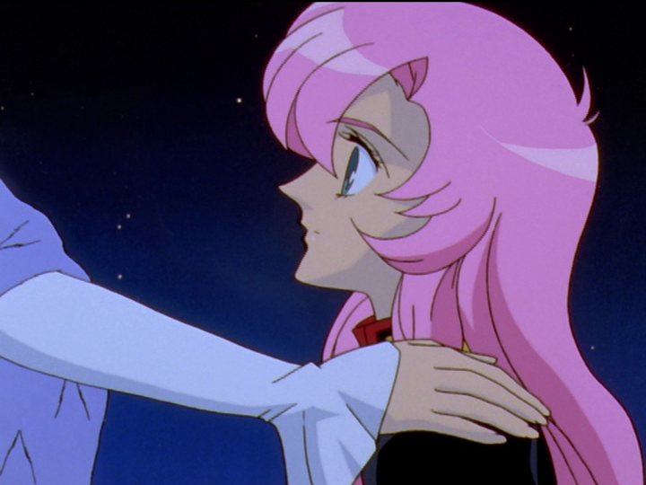 Returning to episode 38, Akio’s smile is confident, his arm around Utena is possessive. It’s the first time she’s seen him in the white prince uniform. He leans over her dominantly as she leans back, looking at him wide-eyed. (Compare her wide-eyed look in episode 7 when Juri is leaning close, and also her wide-eyed look in the picture with Anthy above as she looks at Akio arriving in his car. It seems to mean surprise and interest.) After the suicide conversation with Anthy, she knows for a fact that Akio is abusive and deceitful and keeps Anthy in suffering—and still her hand is on his chest. She desires him regardless—though it is her left hand. She is tempted by his false offer of an eternity of happily ever after...