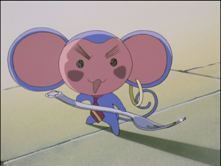 The first of a complex of events that together predict the backstab. The fork is a sword aimed at hated Saionji, as Anthy’s sword is aimed at hated Utena in the backstab. See Chu-Chu’s arc - gags - episode 2 for the full explanation.