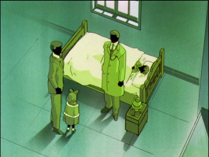 Little Miki is sick in bed. He blames himself for breaking his promise to Kozue, where he ought to blame his parents for not having him vaccinated (common in Japan due to a historical case of bad vaccine that caused mass illnesses). Everything is green and blue-green for control, which could be the control exercised over Miki, or the control over Kozue through their parents. It suggests that Anthy arranged events. If so, did she somehow infect him? It’s not impossible.