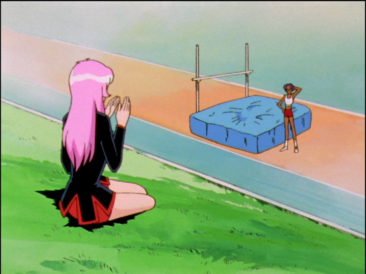 The high jump mat (a landing pad) resembles a bed. Does it participate in the meaning? Apparently not. It is sports equipment and positioned on a running track, which suggests action and progress. On the other hand, the mat is blue for illusion, Utena is facing left, and the blue-green on either side of the track reminds me of gutters, a symbol of Akio’s “guidance”. It seems to be progress in the wrong direction. So it has something to do with beds after all.