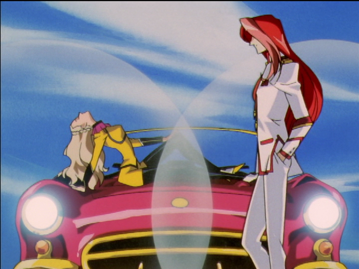 Touga in bed at the end of the episode, talking on the phone with End of the World, who hears nothing he did not already know. Touga and four girls are silhouetted behind a gauzy curtain, meaning concealed evil. Touga’s bandage is surely much larger than his injury justifies. Enough details are visible that we might detect clothing if the artists had chosen to draw any. The hanging cord looks like a bell pull to summon a servant. The future patriarch does not hide his activities from the family servants. He probably couldn’t if he tried.