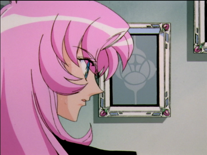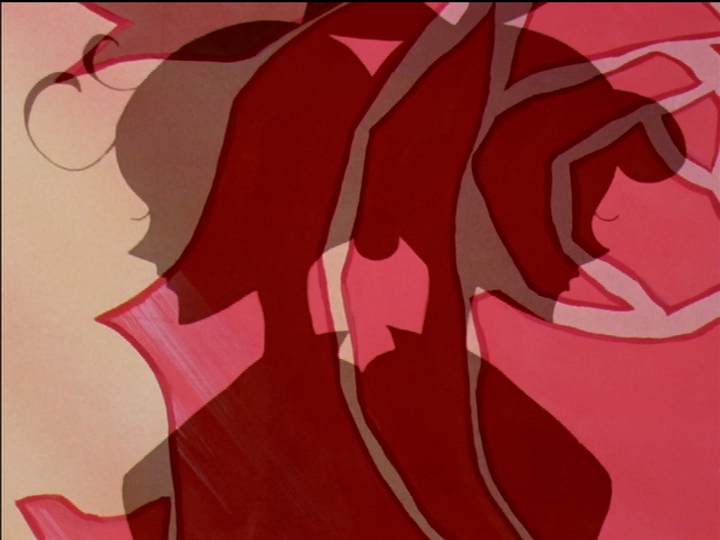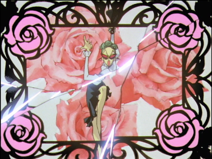 On the one hand, the four points of shadow form a cross in themselves. On the other, along with the circles, they are a reference to Nadia; see three versus four points. When Anthy draws Utena’s sword, it ends with a three-point shadow. In Nadia, the four points are associated with evil. Akio controls the patriarchal Christian church, which is evil. The rose emblem resembles an eye and refers to the magic that he attributes to Anthy.