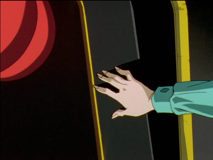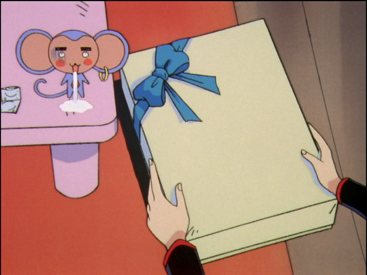 Grasping boxes. The comparison took me a long time to notice, because the episodes are distant. Left, Touga’s dance party dress for Utena. He believes he can catch any girl, and he wants to spark Utena’s desire with a gift. It’s more a gift to himself; he doesn’t think about her feelings. Chu-Chu comments. Right, Akio tricks Utena into touching his hand. He knows that he can catch any girl, and he wants to fan the flame of Utena’s desire. The boxes are traps baited with lures. Akio’s lure is himself, and his box is a reminder of Utena’s past injury in episode 30, and her upcoming metaphorical injury in the First Seduction.