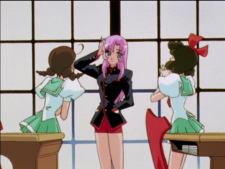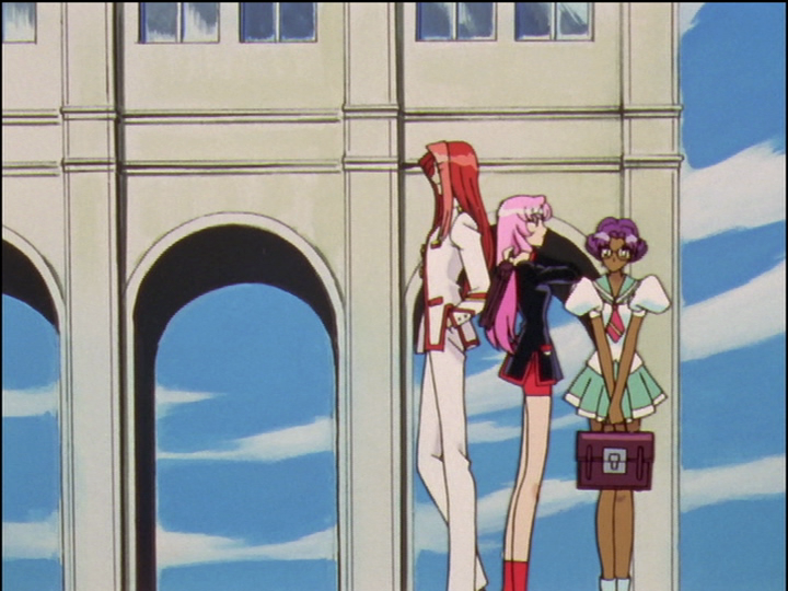 At the start of the series, right after the prince story, Wakaba waits for Utena. The bolder of two girls tells her that Utena has gone ahead, and laughs at Wakaba. The other peers from behind. In episode 12, Wakaba walks ahead of Utena. Two girls with similar colors stand in almost identical poses. They admire Utena in the girls’ uniform.