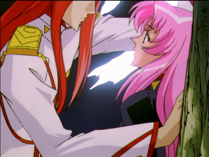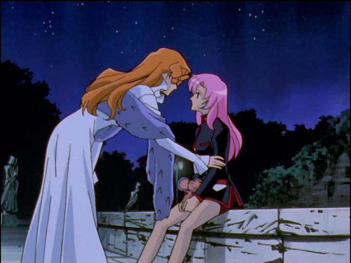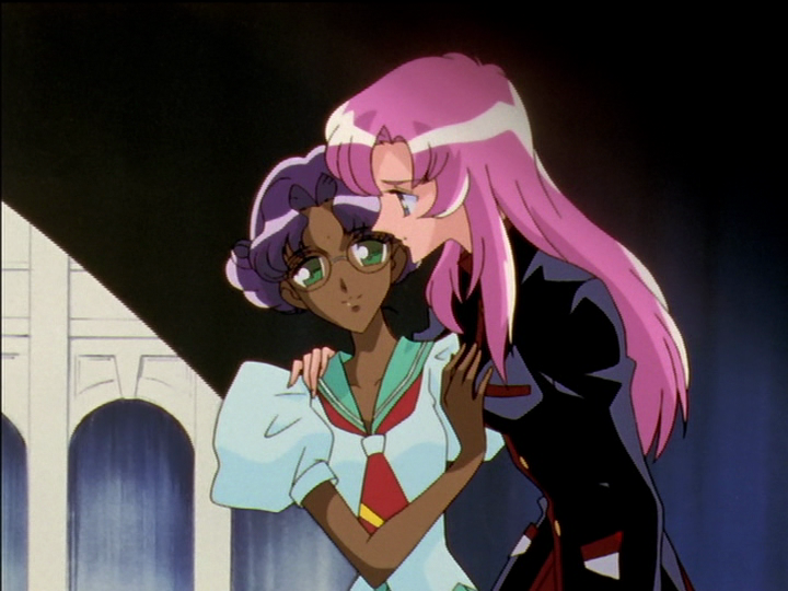 Both are selfish exploitative relationships. In early episodes, although a basically good person, Wakaba is pushy and controlling in her friendship with Utena. She calls Utena her boyfriend and treats her in some ways like a lover, but she’s playful and doesn’t take it seriously. Even Wakaba’s help for Utena in episode 12 is selfishly motivated. In late episodes, Akio is sneakier but also pushy and controlling. He never says, but acts as though he loves Utena, and it’s a lie.