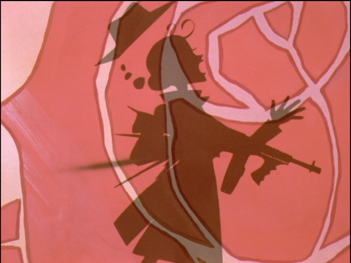 In the shadow play of episode 8, the gangster shoots herself in the back, prefiguring the backstab of Utena and suggesting that Utena brought it on herself. She did: It was a necessary part of her miracle. Though the gangster is played by the bobble-haired shadow girl, who more often represents Anthy; Anthy caused her own troubles. Note eyelashes: The gangster’s eyes are open, as in the comparison above. The images to the right have similar poses, but eyes are closed. Violence and sex are almost the same but usually differ in a key feature.