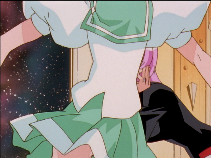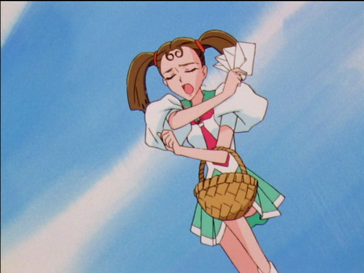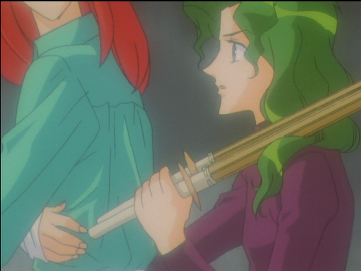The teacher wheels her arms so fast that her hair buns fly up. Wakaba wheels her arms so fast that they multiply. (Nanami does it too in episode 6.) As in the comparison above, wheeling arms indicate frustration over inability to control another person, and it still happens only to women. There are nuances: Unlike the other three cases in these comparisons, Wakaba is being helpful; shortly after this picture she helps Utena escape her depression. One point is that Wakaba can only help; Utena has to escape on her own. It is parallel to Utena helping Anthy escape the Academy; Anthy has to do it on her own. Another point is that helpful and harmful influence over other people are very much alike. The teacher’s actions are as well-meant as Wakaba’s—perhaps more well-meant. If Utena loses her specialness, then Wakaba loses her touchstone.