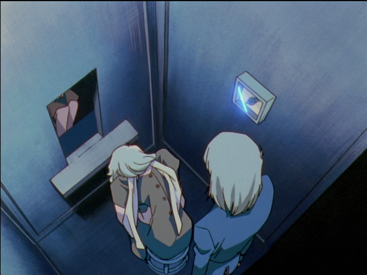 Akio’s tower room at the high point of the world (Olympus) is parallel and opposed to the confession elevator to Mikage’s underworld lair (Hades), the low point of the world. Symbolically, both places are underworlds and are near the End of the World. The confession elevator goes down (except once, for Tatsuya, when it returns to the surface). We see the elevator from a variety of directions: Most typically from above, but sometimes from a low angle and diagonally from outside it, and even from over the shoulders of Shiori and Utena—even occasionally from straight ahead.