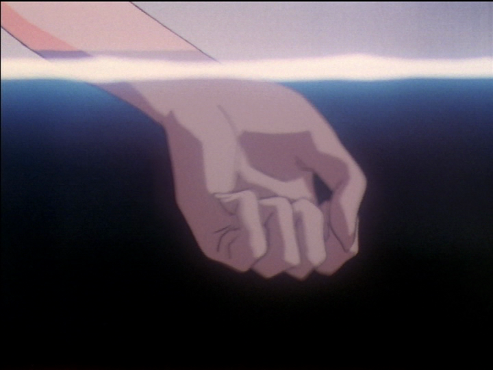 Juri has opened her uniform to take her locket out. The uniform has a hook-and-loop closure. Earlier in the episode, the male hooks are at Juri’s right (frame left) and the female loops are at Juri’s left. Here, when she decides to throw the locket away, the hooks and loops swap sides. The third picture is there mostly because it’s clearer, but also because her eyes are out of frame, meaning that she does not see something.