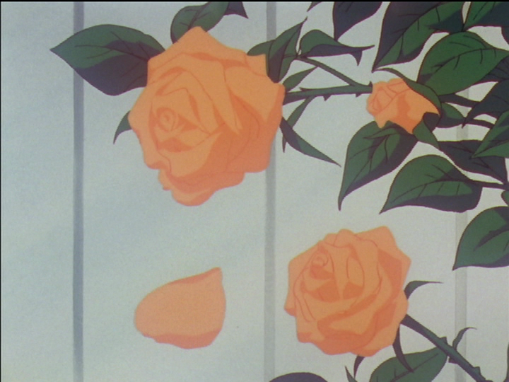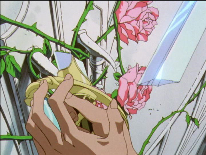 Nanami charges and breaks her sword against the wall of the dueling arena, turning away from her target Utena at the last moment as Touga calls for her to stop. Akio charges and breaks Utena’s sword against the Rose Gate, next to the pink roses that represent Utena and her attachment to Anthy, complete with jealous thorns. Utena’s thorns protect Anthy, who is Sleeping Beauty.