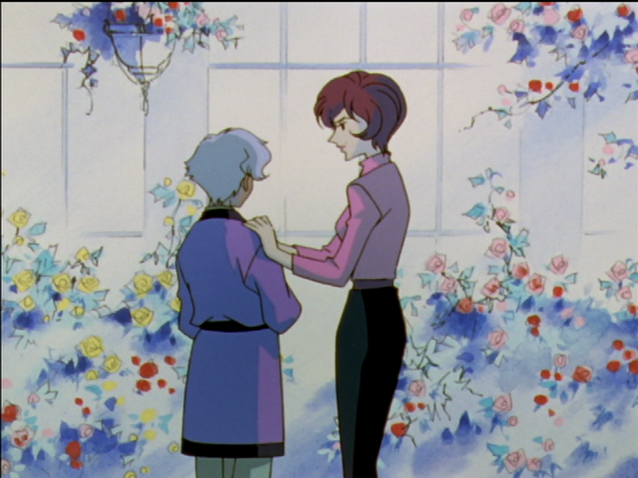 The episode explicitly draws this comparison, showing the images back-to-back with a comment by Mikage, who sees Tokiko in Utena. Both are in greenhouse rose gardens; they are in some sense the same place, except that Akio’s pillar of climbing roses is missing in the Black Rose. Tokiko is admonishing Mamiya for not taking care of himself in his illness. Utena is admonishing Anthy for accepting the Rose Bride role—for not taking care of herself. Both are trying to make another person’s decisions for them. A vertical line runs through wrists in both pictures, separating the characters.
