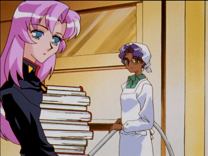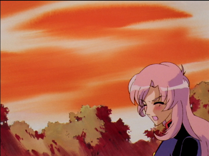 Wakaba presses her friendship on Utena so aggressively that Utena is pushed down and given little scope for action. Her lunchbox is purple. It prefigures Akio leaning over princess Utena in the final showdown. One shows real and the other false attraction, but Utena can’t tell and puts on the same expression. See Utena’s arc - mutual attraction makes Utena girlish for more.