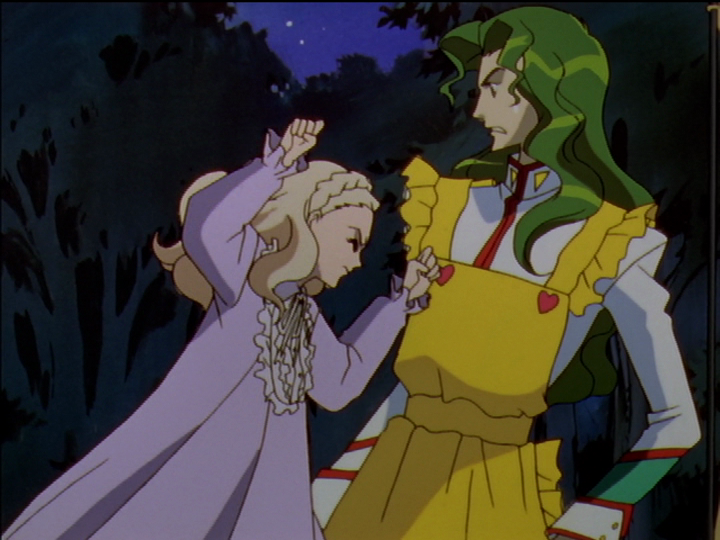 Left, Akio, who keeps himself on top, looks down on Anthy as he controls her with crocodile tears. Right, Anthy, who keeps herself beneath, looks up at Utena as she weeps real tears. She foresees the Swords of Hatred gathering to attack Utena, and the swords are indeed gathering. She is not relieved that somebody else will take on the suffering, she is terrified for Utena and urges her to flee. It is a princely thing to do, self-sacrifice to spare another. Anthy and Utena, for one more moment, are at cross-purposes trying to save each other. But Anthy’s motives are not princely; she believes she deserves to suffer. Self-sacrifice is her assigned role.