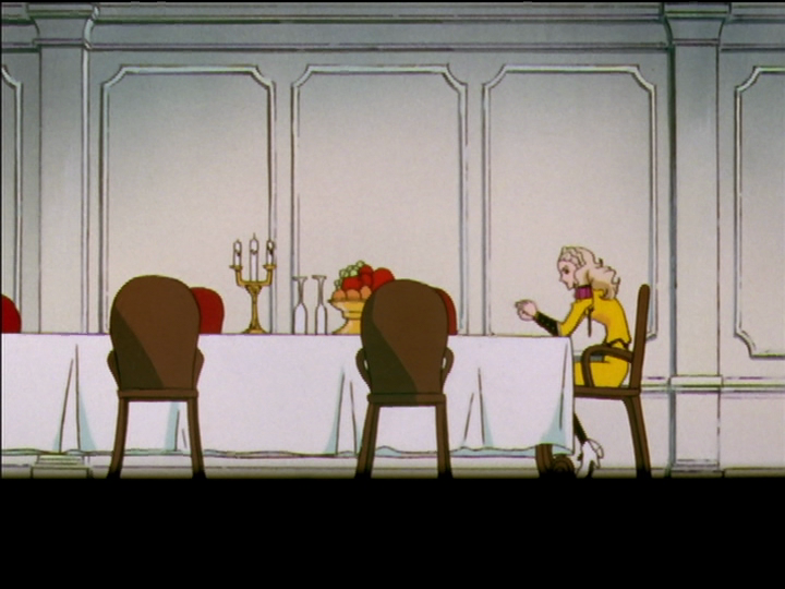 Anthy and Utena are separated from other students in the empty dorm. The dining room there is full of long tables with empty chairs. In the Kiryuu mansion, Nanami and Touga sit at opposite ends of the long dining table, and raise their voices to speak to each other. Candles in the middle separate them further.