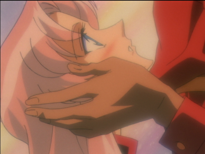 In episode 30, Akio is about to kiss Utena as a step toward corrupting her. Utena shows her wide eyed upward look. He has stolen her shoe and leans over her dominantly, and she is about to accept it and let herself drop backward into the car. A hand is on her face. Compare little Utena with the prince above, telling her that he can’t save Anthy. The prince is claiming to place a responsibility on little Utena: You can try to save Anthy. Akio is tempting Utena while claiming to acquiesce in her desires. Both are controlling Utena. Placing a hand on her is possessing or manipulating her—that is what hands do. In episode 38 Akio does it again, before pulling Utena’s sword and turning her into a princess. He rubs his thumb over her lips, symbolically saying that he possesses her sexually.