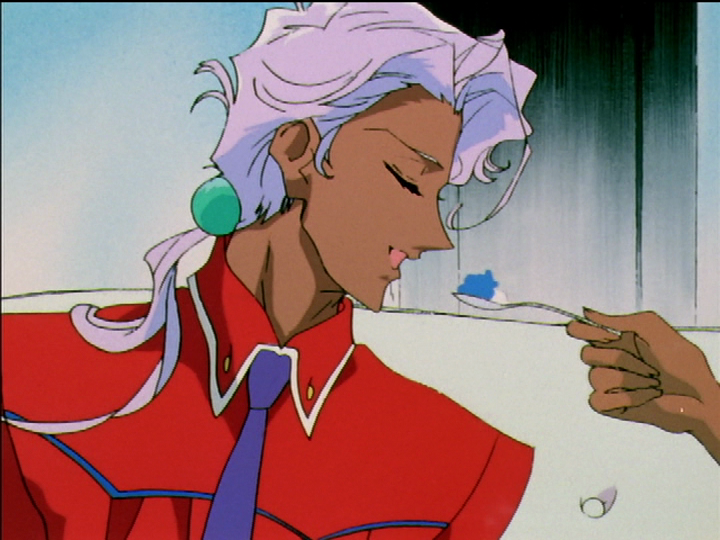 The pink drink is surely alcoholic, and a (not yet written up) scene from Onii-sama e convinced me that the orange ones are too. Like driving and donating blood, they point to adulthood. Brightly-colored alcoholic drinks suggest a childish kind of adulthood. The orange color may mean one-sided love of Akio, and just maybe Anthy’s perceived one-sided love of Utena.