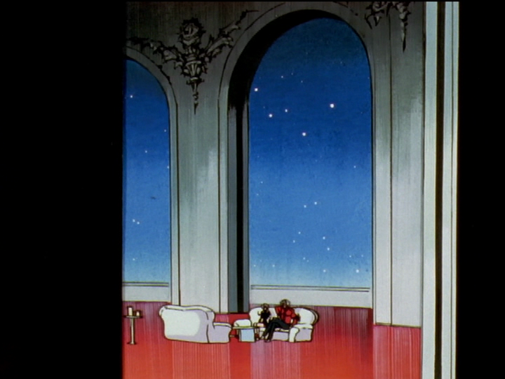 The elevator to Akio’s tower room also has a red interior. The doors bear a large rose emblem. The rose emblem is solid, but the rest of the door is made of vertical bars like the Student Council elevator, so that the elevator car is a prison cell. We don’t see the elevator move; we always see it from Akio’s room, whether the doors are closed or open: Akio seeks cultural stasis for the world, the maintenance or increase of his power. In the picture, the doors are opening as Anthy brings Utena to visit Akio for the first time. We always see the elevator and its contents from head on, the opposite of the Student Council elevator: The power is real.