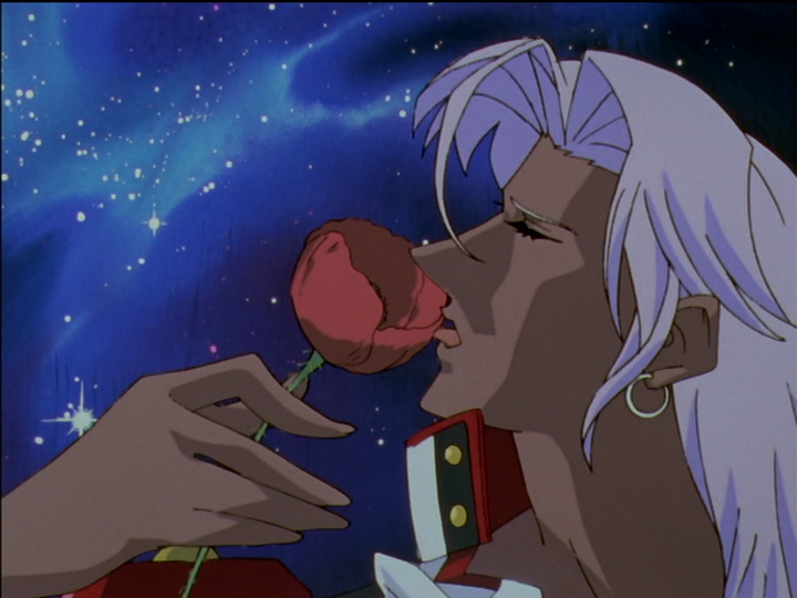 Ruka kissed Juri and ended up with a hurt lip. Utena’s injury is time-reversed: She hurts her lip and ends up kissed by Akio. The comparison seems to imply that Touga kisses Anthy: She is his bride, and he takes it seriously. Ruka’s injury was caused by a physical bite and is on his right side for reality. Utena’s was caused by an apparition of Akio, and is on her left side for illusion.
