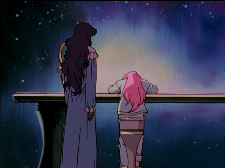 Utena is watching the action below. She has not yet run across a way to fulfill her ambition of becoming a prince; the way turns out to be Akio’s dueling system. Wakaba is only enjoying the weather, and perhaps thinking back on her own vague memories of her prince. Akio recently intervened in Wakaba’s life, as he intervened in Utena’s when she was little. Wakaba’s episode 1 hasn’t started yet, or perhaps is just starting.