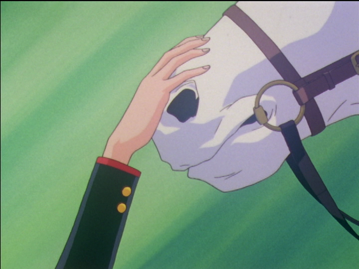 The bridled horse is under Akio’s control, and it looks uncomfortable.