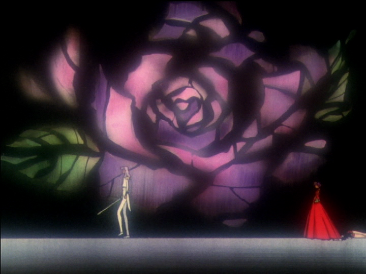 Two representations of Anthy’s coffin. Left, a theatrical version for Touga’s fake rescue plot. Anthy’s pretend coffin lies in a red rose for Anthy. Next, the version that little Utena meets. The rose is veined with the Swords of Hatred and falling to pieces. The disintegrating rose goes with Utena’s diseased rose in the final showdown, right.