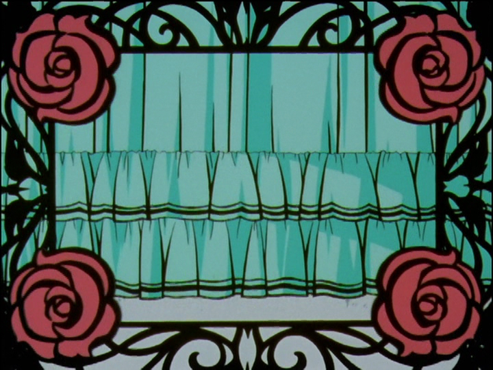 At the start of the first version of the prince story, the theater curtain rises. It has two rows of striped ruffles at the bottom. It matches little Utena’s imaginary princess dress, which has two rows of striped ruffles at the bottom.