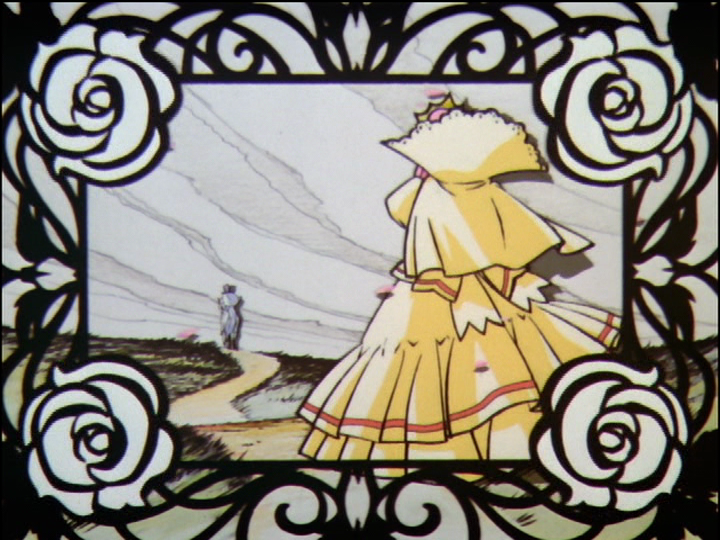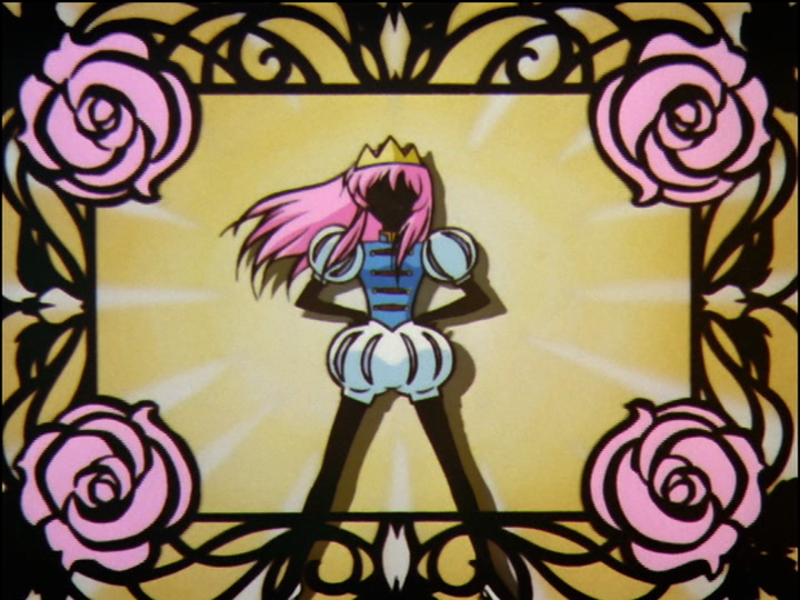 Little prince Utena. Little Utena, who sees herself as a princess, seems to have some trouble imagining herself as a prince. On first viewing it looks convincing, but later we learn that the crown is a princess crown, and that the puffy sleeves are like those of the girls’ uniform (and other puffy women’s sleeves such as Kanae’s). The round shapes are symbolically female, including the curved crown. The spread legs are male, but a prince’s hands should be out for action, not behind her back (well, you could say on her hips).