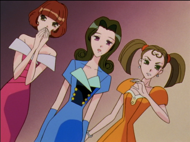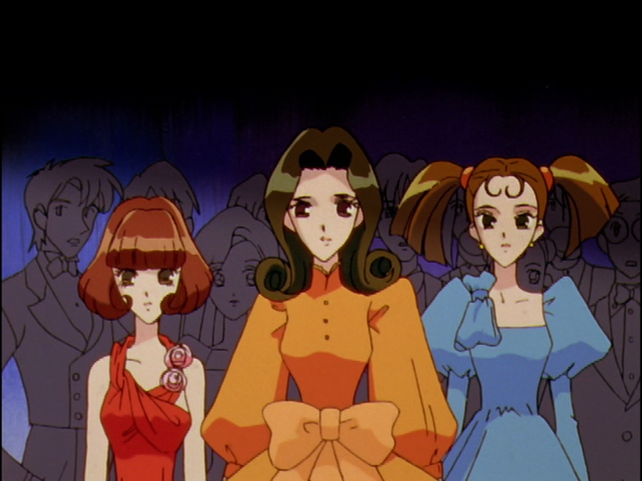 The shade varies between light orange and darker red-orange. For example, it is reddish when she sits beside Akio and when she talks with Anthy. The pink roses and the dress’s lack of pockets are hints that Kanae is a lesbian.