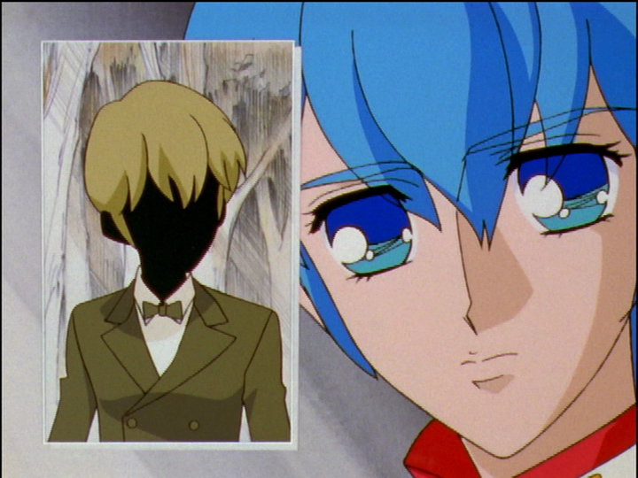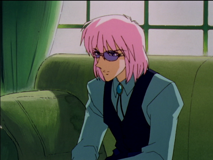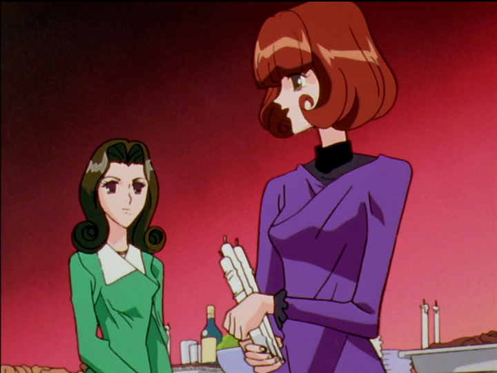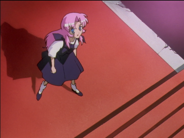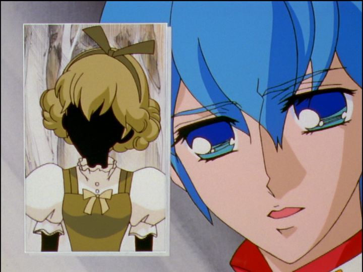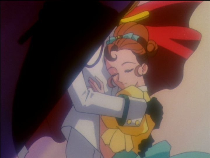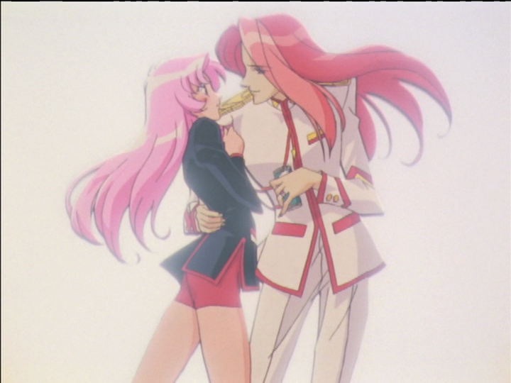 Those are Utena’s blue eyes turned darker, not Tokiko’s bicolor black-blue eyes, which are slightly greenish. Utena’s hair is a bit more extreme than Tokiko’s too, though they are similar. Mikage’s illusion is not perfect; as we find out in the duel, his memory is flawed. He has forgotten the mole next to Tokiko’s mouth. He sees her as wearing the outfit that Tokiko wore when he visited her at home, complete with the flower-like emblem, but dressed in Utena’s pink rather than Tokiko’s purple. The two colors are the same hue; Utena’s pink is light purple.