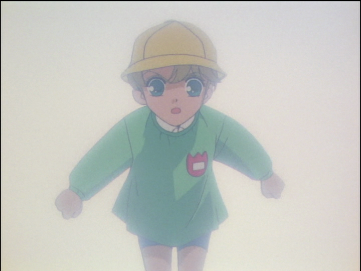 In the church. Younger Touga wears blue-green and white, with short pants because he is still a child. His purple stockings are part of Academy’s elementary school boys’ uniform, presumably to be worn in cold weather. Cold in Utena means emotional coldness.