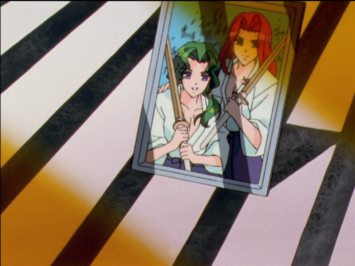 Photo. Later in the episode, we see a photo on Saionji’s desk. Younger Touga and Saionji wear white gi and blue hakama for kendou. The gi are open at the chest for the open shirts symbolism, Touga’s hand is on Saionji’s shoulder, and they carry phallic symbols in their hands. It foretells their future relationship. It also separates them with a shadow, which falls mostly on Touga.