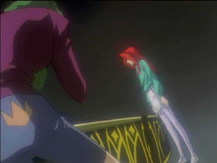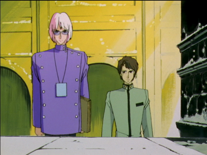 Music teacher. We see him from Kozue’s point of view, as he sexually harasses Miki who (like Utena sexually assaulted by Akio) does not notice it. He wears purple with slightly pink pants, and rings on three fingers of his left hand. Purple is for corruption, pink is for homosexuality (compare Juri’s pants), and the rings are ostentation—the guy is showing off. And they are presumably ties to Akio. He has dark red hair for his sexual sin; compare Touga’s bright red hair.