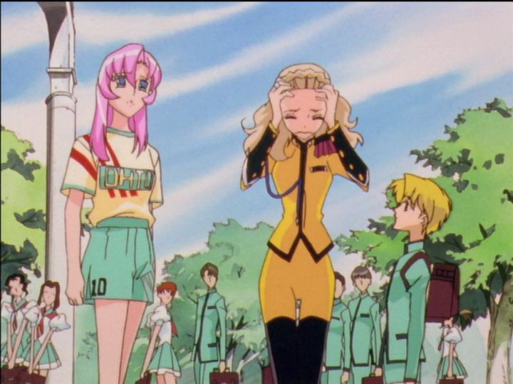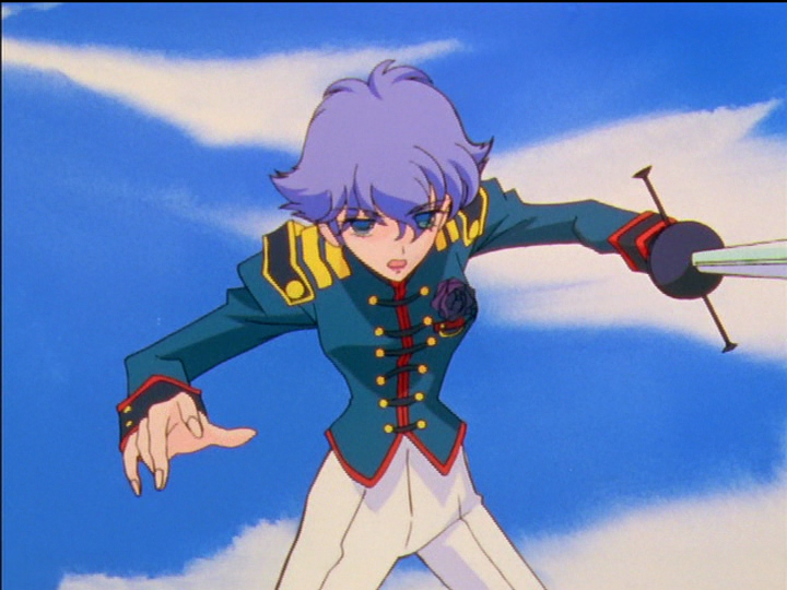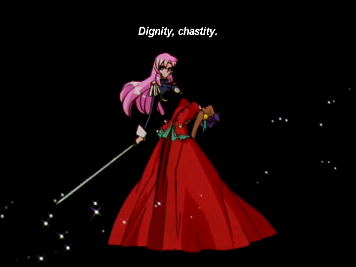 The standard student uniforms are chosen by the Academy and tell us what the Academy wants the students to seek. The Academy’s control seems to be mostly effective; most students usually do seek what they are supposed to. Utena’s refusal to wear the standard uniform is a refusal of the Academy’s control. She does wear the girls’ uniform in the body swap episode 8—when she ignores it—and in episode 12 after becoming girlish—when she temporarily accedes to being controlled and feels miserable about it. Acceding to control is a choice, and the choice is independent of surface appearance or the symbols attached to it.
