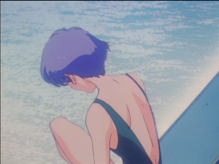 When jumping as Anthy, Utena wears a white sports bra instead of black, with her standard red shorts. The jump aligns with her basketball jumps, which are miraculously high. Though nobody else is around except Anthy, she gets an admiring panning shot that seems to go with her crowd of admiring fangirls from episode 1. One point is that Utena is admired and Anthy is not (she is despised). Another is that behavior draws admiration or contempt, not appearance (not always a realistic claim). As Utena points out, it is Anthy admiring her own body. Anthy can do what Utena does, though she chooses not to—I take it as an early sign that she is able to escape the Academy. (Though I expect that the swap is an illusion and Utena remains in her own body.)