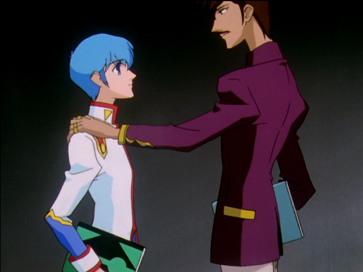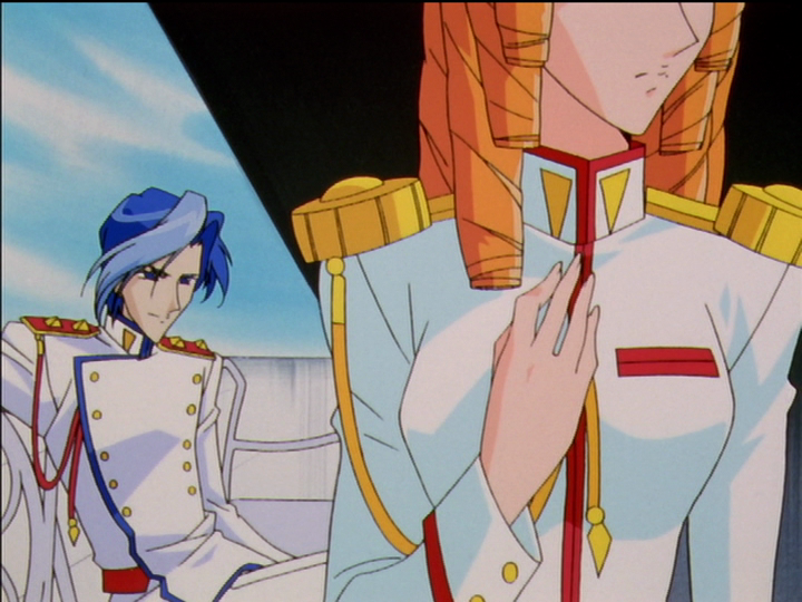 The prince uniform. The prince version adds epaulets, princess gem, and that rope thing called an aiguillette (why did I have to learn that word?). Apparently it’s common to have a whole sheaf of aiguillettes if any, but I can imagine why they didn’t want to animate that. Anthy’s princess gem and aiguillette match Utena’s.