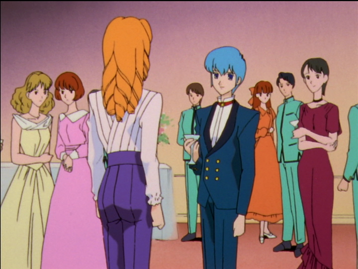 The prince uniform and Utena’s hair length both purport to tell us whether she is being a prince, but they do not always agree with each other. Her hair length seems to be the more timely indicator. In the dueling arena, she wears the prince uniform (except in episode 1 when she is not yet a prince), even when she is being an ordinary girl. For example, in episode 36, the Second Seduction leaves her girlish for the rest of the episode, and she wears the uniform in the arena while girlish.