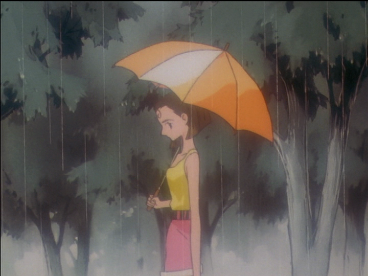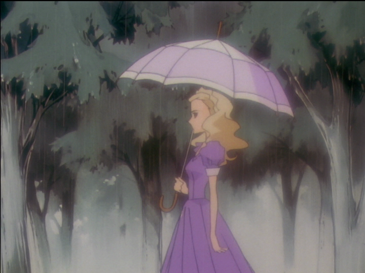 The nightgown is Juri’s only purely girlish outfit. Her other costumes have trousers and are at least partly boyish. She shows male power to the world, but at night she is herself and accepts her appointed sex role—and/or Akio’s power is greater at night. She wears the nightgown in episode 7 when she meets Utena by the water, and in episode 28 when she sees Ruka and Shiori together. She wears the shawl in both cases—both are outside. After seeing Ruka and Shiori, she goes inside and sits without the shawl. The shawl can point to the emotional coldness she feels in the outside world.