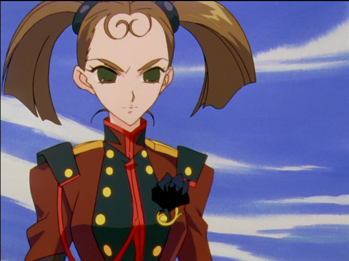 The duelist uniform is dark green for control. Wakaba is trying to control Utena. It is trimmed with black, red, and yellow, and that is an ample supply of yellow buttons. She envies Utena’s specialness—she all but says so. The trousers are white for her supposed prince Saionji, whose sword she uses—the black rose has encouraged her to turn specialness against specialness. It’s just as easy to argue that the trousers are white for prince Utena. Her hair ribbon has turned black; she is under the influence of the black rose.