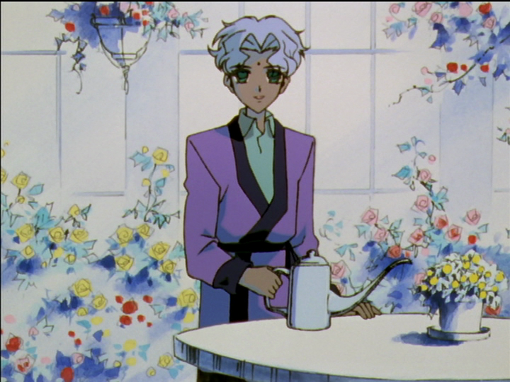 Apron. Anthy does not cook, but Akio does, a role reversal that comes about because Anthy is kept—and because Akio uses his cooking skills to impress women. Here he impresses Utena. The apron is pale blue for the illusion he is presenting. See comparisons - teasing for more. Akio freely breaks the rules and roles he sets for others.