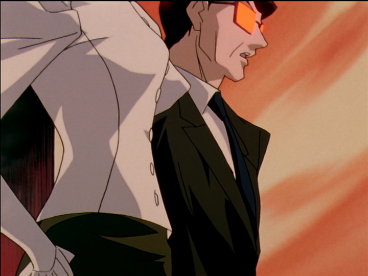 His colors in episode 30 match the female teacher’s, and I conclude that his motivations match. He sweats with nervousness when talking with Akio in episode 30, and his glasses shine orange for one-sided desire. His white shirt is hidden under the suit because his desire must be kept hidden (that works for episode 7 too).