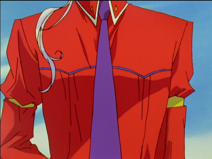 It’s hard to tell in this image, but he has red hip pockets like other male duelists. Ruka does not have a breast pocket; he is heartless and seeks sex but not love. In his episode 28 duel, his blue rose sticks to his uniform on its own.