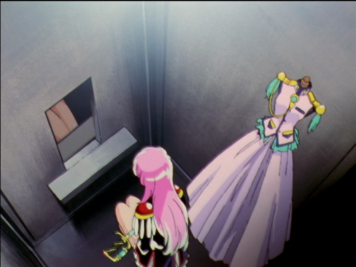 Princess dress of the final showdown is pink for Utena, but shaded toward blue so that it is just as much light purple. The voluminous skirt of the dress is supported by white petticoats for the prince—the prince helps make her a princess. When we see the dress, the light from the background is always blue; we can read it as the blue light making the pink dress look purple. Though note: In the elevator, Utena’s hair remains pink (even white at the edges though ordinary girl length), unaffected by the blue light as she rejects Akio’s arguments. Other princess dresses have white trim and white pockets for the prince, but Utena’s has black for Akio. She knows that he is evil and accepts him anyway.