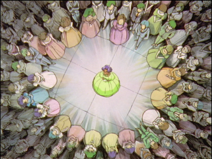 Anthy at the dance party has been brought onto the floor by Nanami and abandoned there. With her fear of crowds, she perceives the crowd around her as dense and focused on her. Her perception must be exaggerated, but it’s not unmotivated. She is regularly blamed for things that are not her doing (never mind that she gets away with many undetected evils). Anthy learned her fear of crowds in episode 34. Prominent colors are green for control and purple for corruption, and there are others.