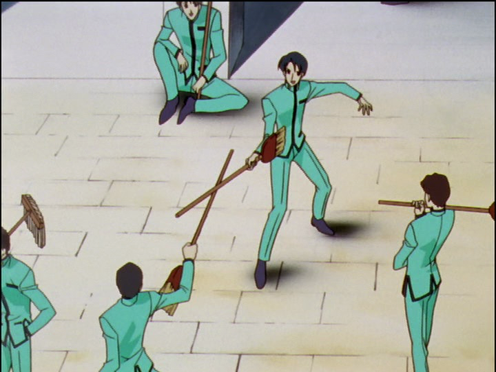 Juri and Utena are at the window, talking and looking out at students between classes. The girls and boys have self-segregated, and they are engaged in Akio-approved gender-appropriate behavior: The girls are sitting on the soft grass talking, the boys are on the hard pavement, carrying brooms and playing at sword-fighting. Well, one boy has a limp mop. They have learned their roles well—except the red-haired girl, who is sitting with a somewhat boyish posture (though her legs are girlishly together).