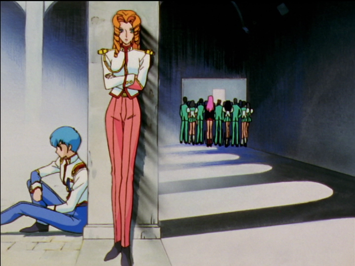 The rear row of the crowd is arranged boy-girl-boy-Utena-boy-girl-boy-girl. Juri and Miki continue the pattern leftward, Juri supported by a male column and Miki framed in a female arch for their non-conventional gender identities. I don’t know what the orderly pattern means, beyond that everyone is interested—and that Utena is treated by the crowd as female. It does align with the shadows of the orderly male columns and female arches of the colonnade, though. The crowd is beyond a square opening that contrasts with the rounded arches. Juri’s shadow looks meaningful.