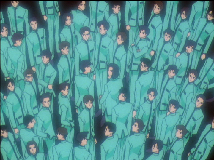 There are 100 Black Rose boys under Mikage. This is 50 of them. They are on a black background for the darkness of Mikage’s underworld realm of death. They start out facing away from the camera, but turn their heads in unison, in what feels like a horror movie shot. Are they monsters or victims? I think both. Of course Mikage sacrifices them all at the end of the arc (which we see late, but it happens before any of Utena’s duels). Before then, they didn’t seem to mind seeing one of their number wheeled past in a coffin. No doubt they killed each other in duels, seeking the way to progress. Is this after 50 fatal duels?