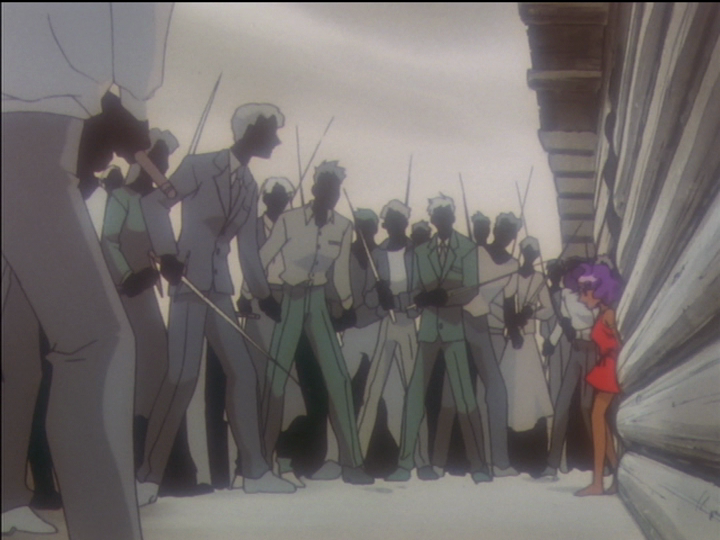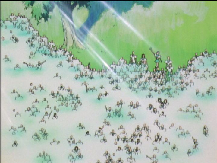 Anthy learns her fear of crowds as sword-carrying people call her a witch. It is part of the origin myth; Anthy remembers it, but it did not happen (though similar things likely have). The predominant crowd color is green for the control the crowd wants to exercise over the prince and therefore over Anthy. Here come the Swords of Hatred.