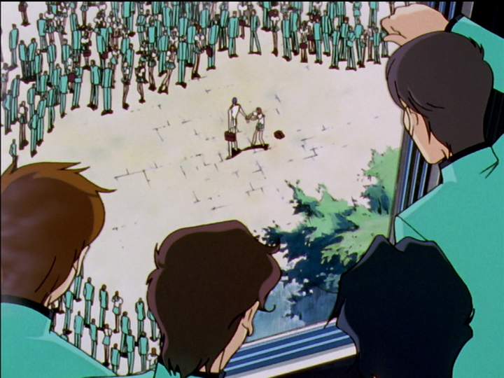 In Utena-world, only boys are drawn to gather around a love letter posted on the bulletin board. Wakaba and Utena stopped out of curiosity—what is this crowd for? The sex self-segregation is pretty solid at Ohtori Academy. Similar crowds gather in episode 10, Saionji’s expulsion notice (regularly arranged boys and girls), and episode 15, the final exam schedule (irregularly arranged boys and girls).